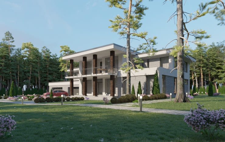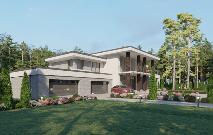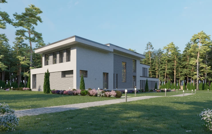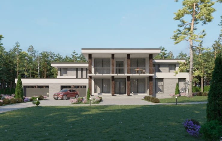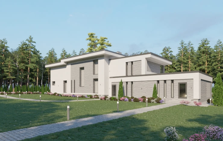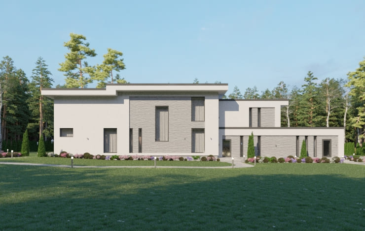 Проектом предусматривается два полных этажа с мембранной плоской крышей. Компоновка этажей выделятся функциональностью и принимает во внимание размещение инженерных систем, вид из окон и расположение сторон света. Планировочные решения предусматривают 6 уютных спален и 5 санузлов. Площадь всех помещений коттеджа - 535 м2, размер кухни 7 м2. В этом проекте мы предусматриваем вариант фундамента - бетонная мелко-заглубленная утепленная лента. Данный вариант фундамента идеально подходит, когда под домом существенный перепад высоты, или хозяин дома требует приподнять выше над землей уровень помещений. Материал несущих стен - монолитный каркас. Мы можем переделать проект под другой материал стен, актуализировать внутреннее пространство коттеджа и учесть любые другие условия заказчика.