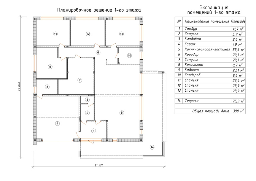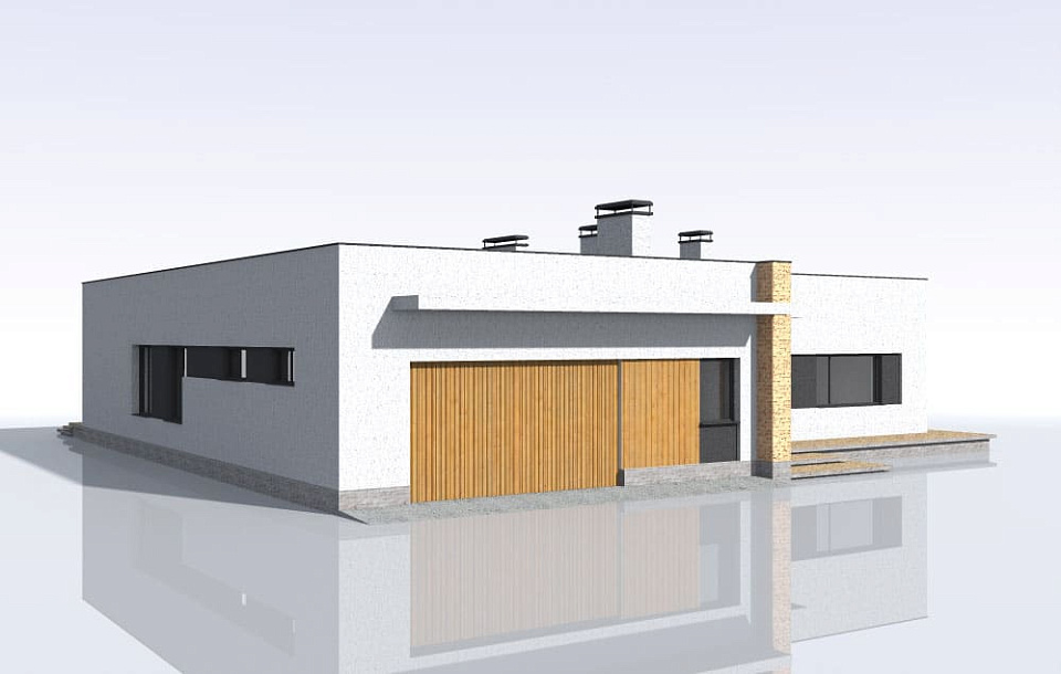 Проект в один этаж с плоской крышей из ПВХ мембраны. Планировка внутреннего пространства выделятся разумностью и принимает во внимание размещение инженерных систем, вид из окон и расположение сторон света. Планировочные планы дома предусматривают 3 уютных спальни и 2 санузла. Планировочная площадь всех помещений составляет 390 м2, площадь кухонного пространства 15 м2. В этом коттедже мы рекомендуем применить фундамент - бетонная мелко-заглубленная лента с утеплением. Этот фундамент оптимально подходит, когда на участке существенный перепад высоты, или хозяин требует приподнять высотную отметку первого этажа над землей. Несущие стены данного здания - керамический кирпич. Мы можем переделать данный проект под другой материал, уточнить планировки коттеджа и принять по внимание другие ваши условия.
