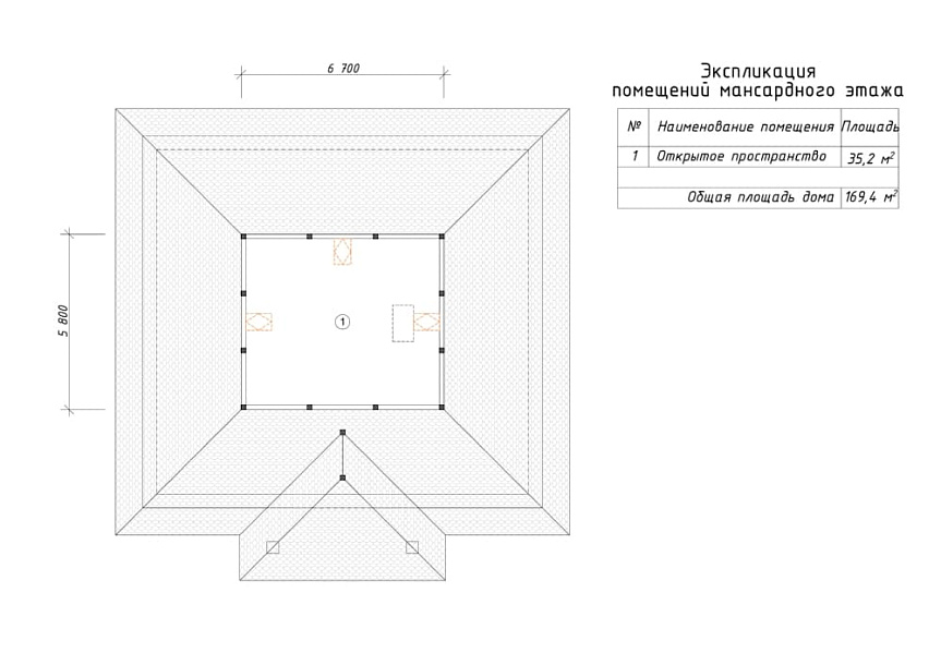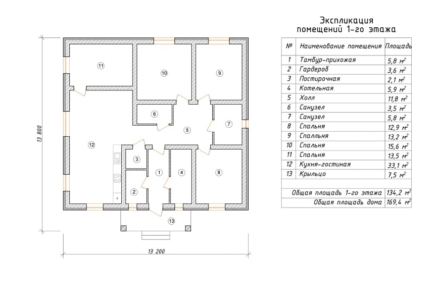 Проект одноэтажный и практичный мансардный этаж. Компоновка комнат отличается функциональностью и учитывает размещение инженерных систем, вид из окон и расположение сторон света. Проектом предусматривается 4 комфортных спальни и 2 санузла. Полезная площадь помещений составляет 169 м2, размер кухонного пространства 20 м2. В данном проекте мы предусматриваем вариант фундамента - монолитная армированная плита толщиной 300 мм. Это надежный и наиболее дешевый вариант фундамент из всех. Стены этого здания - пеноблоки. В случае необходимости мы можем изменить проект под другой материал несущих конструкций, адаптировать поэтажные планы коттеджа и рассмотреть другие требования заказчика.
