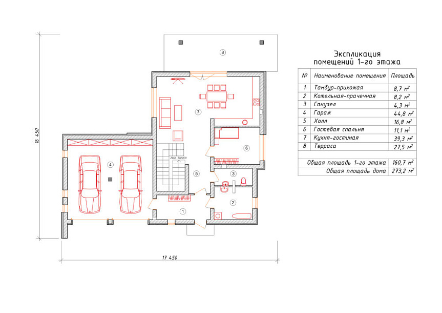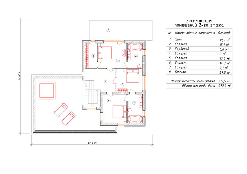 Дом в два полных этажа и плоская кровля. Компоновка пространства дома характеризуется функциональностью и принимает во внимание размещение инженерных систем, вид из окон и расположение сторон света. Планировочные планы включают 4 комфортных спальни и 3 санузла. Планировочная площадь всех помещений составляет 273 м2, площадь кухонного пространства 15 м2. В этом доме мы предусматриваем фундамент - УШП плита. Это наиболее энергоэффективный фундамент, идеально подходящий для индивидуального строительства в нашей климатической зоне. По проекту материал несущих конструкций - несъемная опалубка. По решению заказчика наши конструкторы изменят проект под другой материал, архитекторы адаптируют планировки этажей и рассмотрят другие ваши требования.