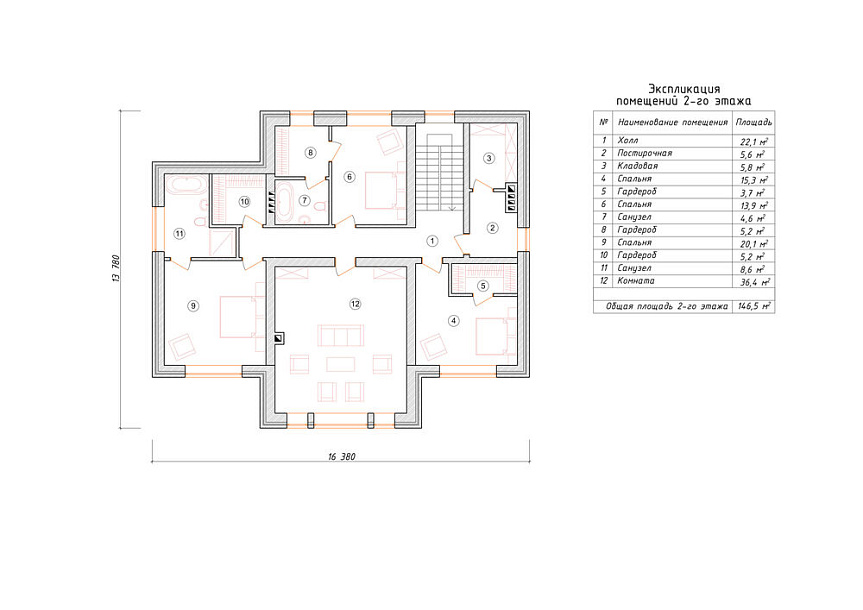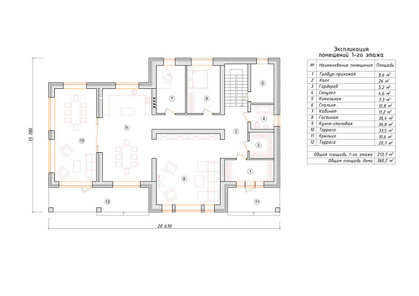 Проектом предусматривается два полных этажа с полезным чердачным помещением. Компоновка этажей выделятся разумностью и принимает во внимание размещение инженерных систем, вид из окон и расположение сторон света. Планировочные планы дома предусматривают 4 уютных спальни и 3 санузла. Планировочная площадь всех помещений дома составляет 360 м2, площадь кухонного пространства 15 м2. В этом проекте мы советуем применить тип фундамента - монолитная лента мелко-заглубленная с утеплением ЭППС Такой вариант фундамента хорошо подходит если под домом значительный перепад высоты, или хозяин дома просит приподнять над землей уровень помещений. Стены данного дома - монолитный каркас. Мы можем переделать проект под другой материал стен, адаптировать расположение комнат и принять по внимание любые другие требования заказчика.