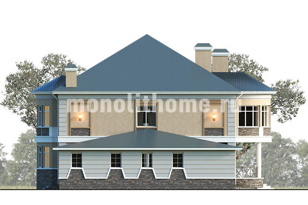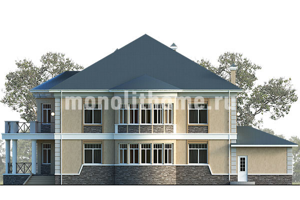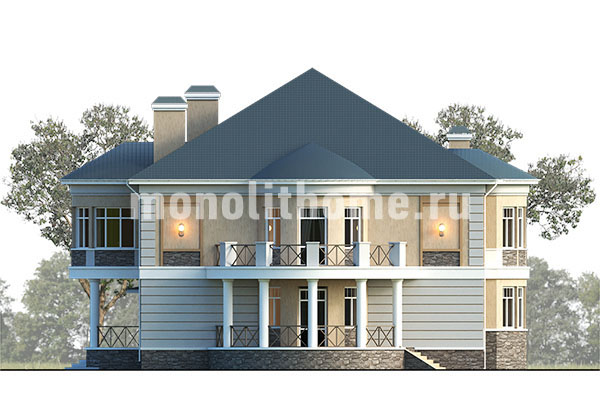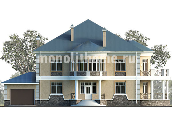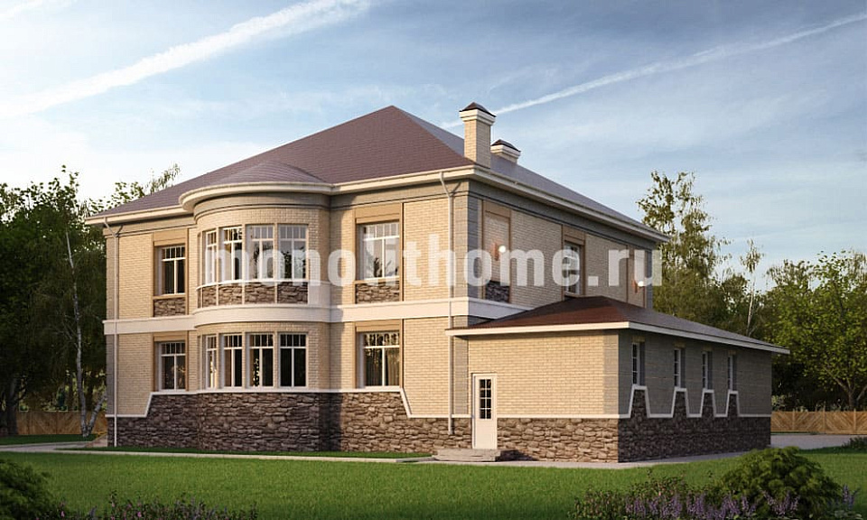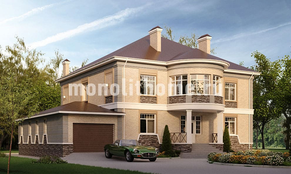 Проект двухэтажный и удобный чердак. Планировка комнат выделятся продуманностью и принимает во внимание размещение инженерных систем, вид из окон и расположение сторон света. Планировочные решения коттеджа включают 4 удобных спальни и 2 санузла. Размер дома составляет 427 м2, размер кухни 28 м2. Для этого дома мы рекомендуем использовать тип фундамента - мелко-заглубленная плита с утеплением толщиной 250 мм. Это надежный и самый экономически целесообразный тип фундамент из всех. Материал стен данного здания - полнотелый кирпич. Наши конструкторы могут изменить этот проект под другой материал несущих конструкций, архитекторы детализируют расположение помещений и примут во внимание другие требования заказчика.