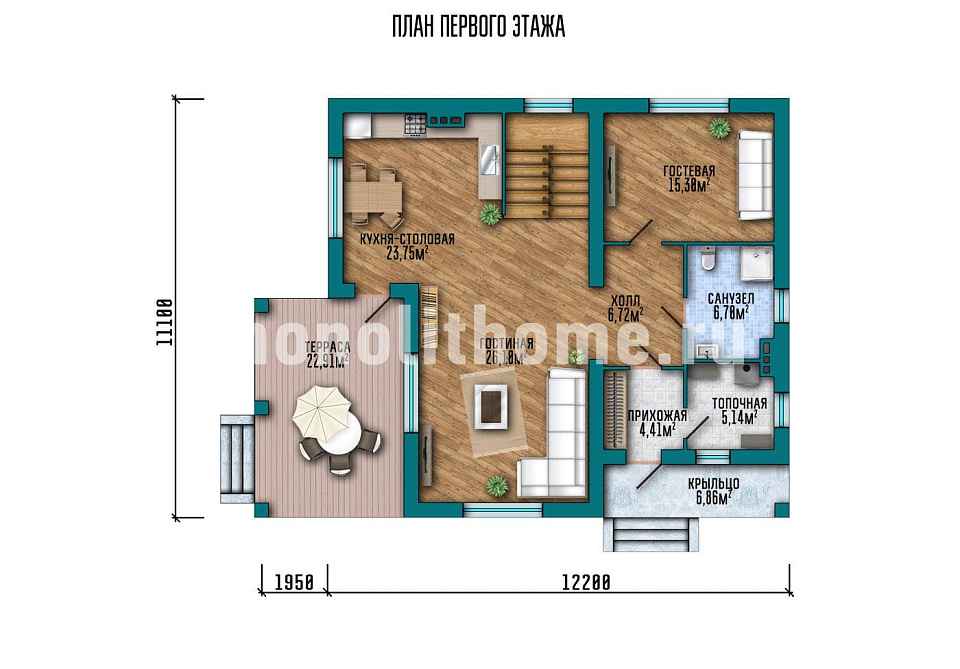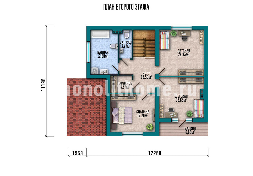 Проектом предусматривается один этаж плюс романтичная мансарда. Планировка помещений характеризуется функциональностью и принимает во внимание размещение инженерных систем, вид из окон и расположение сторон света. Планировочные планы предусматривают 3 уютных спальни и 3 санузла. Площадь всех помещений здания - 194 м2, размер кухни 23 м2. В этом коттедже мы предусматриваем фундамент - УШП плита. Это наиболее теплый фундамент, оптимально подходящий для индивидуального строительства в нашей климатической зоне. Несущие стены этого коттеджа - щелевой кирпич. По решению заказчика наши конструкторы переделают проект под другой материал стен, архитекторы детализируют планировки и рассмотрят любые другие пожелания клиента.
