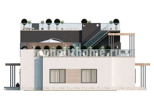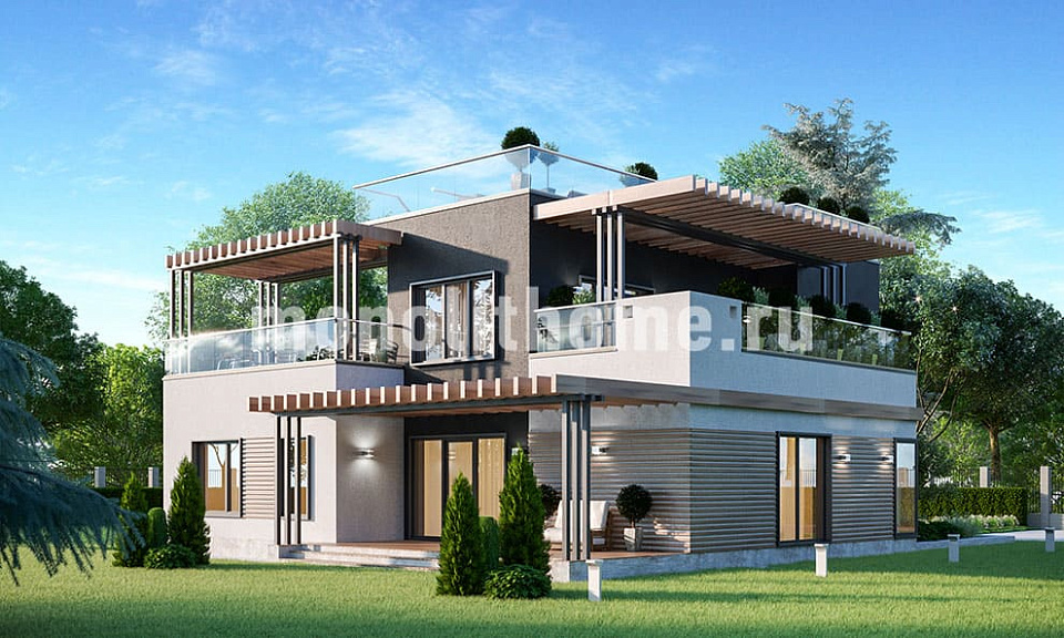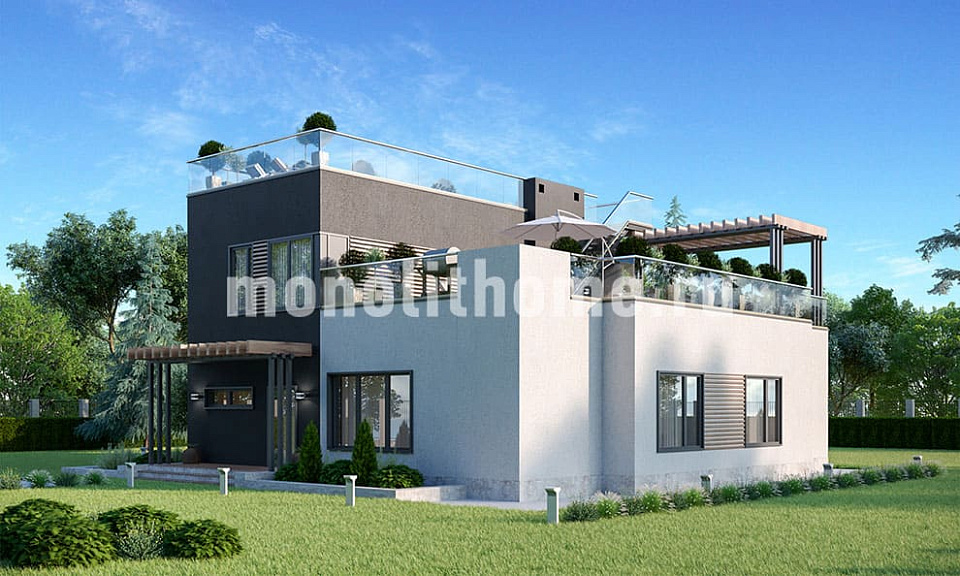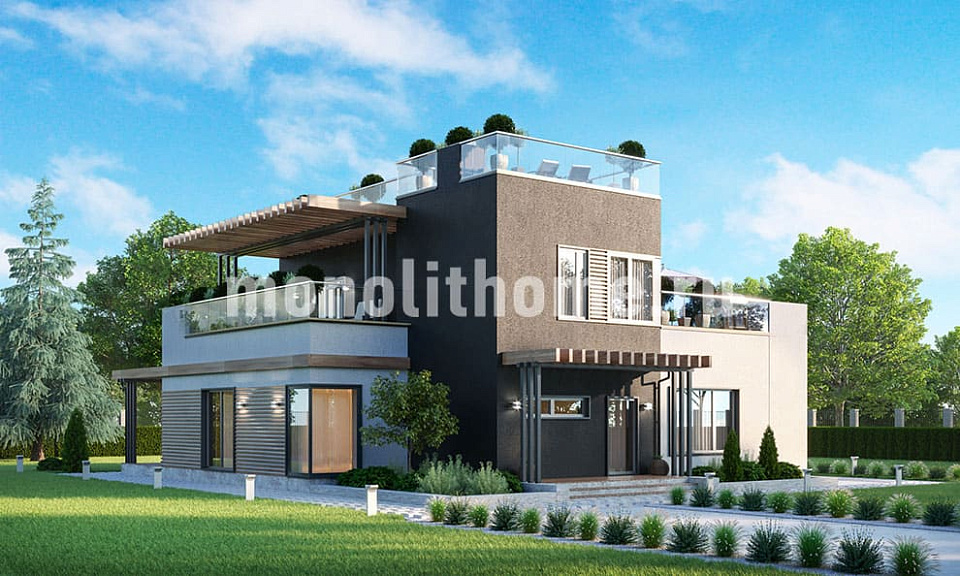 Проект элитного дома "Везувий" разработанный нашими специалистами по результатам встречи с заказчиком в нашем офисе. Индивидуальность данного коттеджа это - практичная эксплуатируемая кровля. Такая кровля экономически выгодна так как позволяет расширить полезную площадь дома без лишних финансовых затрат. На этой крыше можно организовать шикарную террасу для чаепития. И при этом какая прекрасная картина на окружающий мир откроется с крыши вашего дома!