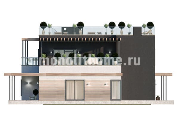 Коттедж двухэтажный с плоской крышей из ПВХ мембраны. Планировка внутреннего пространства отличается продуманностью и учитывает размещение инженерных систем, вид из окон и расположение сторон света. Планировка включает 4 комфортных спальни и 3 санузла. Полезная площадь всех помещений дома составляет 318 м2, размер кухонного пространства 25 м2. В этом доме мы советуем применить фундамент - монолитная лента мелкого заложения с утеплением Данный вариант фундамента хорошо подходит если в пятне застройки большой перепад высоты, или клиент хочет поднять над землей уровень первого этажа. Материал несущих конструкций данного здания - газосиликат. Наши конструкторы могут изменить данный проект под другой материал, архитекторы симметрично развернут планировки этажей и примут во внимание любые другие ваши пожелания.