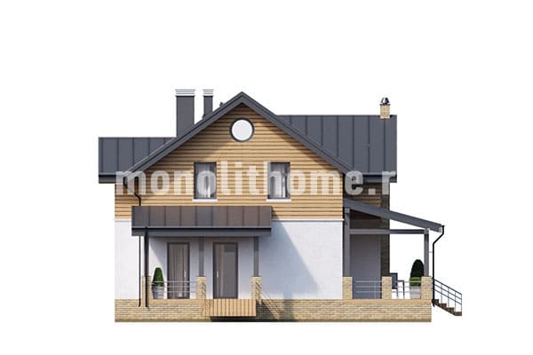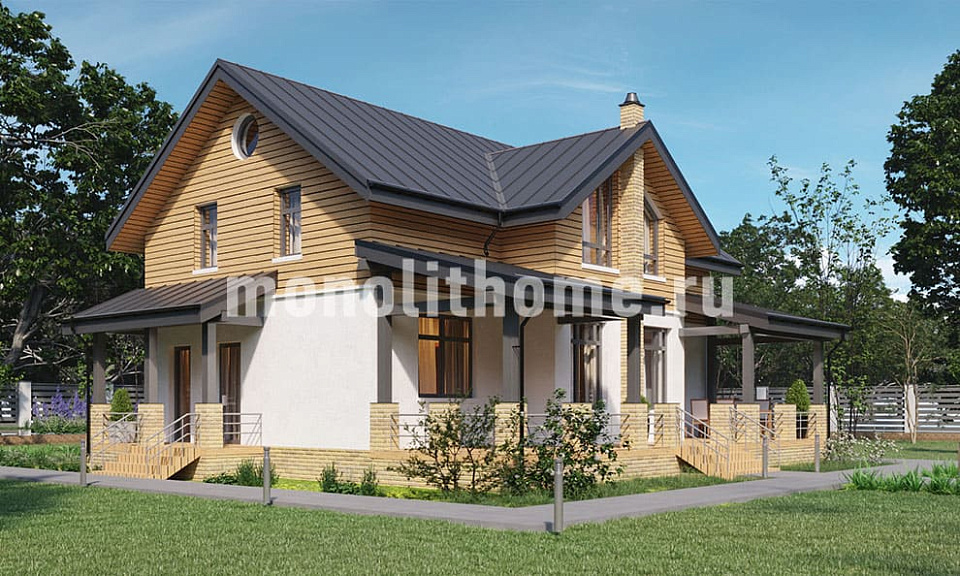 Проектом предусматривается один полный этаж и практичная мансарда. Компоновка внутренних помещений отличается функциональностью и принимает во внимание размещение инженерных систем, вид из окон и расположение сторон света. Планировка коттеджа предусматривает 2 удобных спальни и 2 санузла. Размер помещений дома составляет 199 м2, площадь кухни 28 м2. В этом доме мы рекомендуем использовать фундамент - УШП плита. Это наиболее теплый фундамент, оптимально подходящий для загородного строительства в нашем холодном климате. Стены по проекту - комбинированные дома. Мы можем изменить проект под другой материал стен, адаптировать планировки помещений дома и учесть другие условия заказчика.