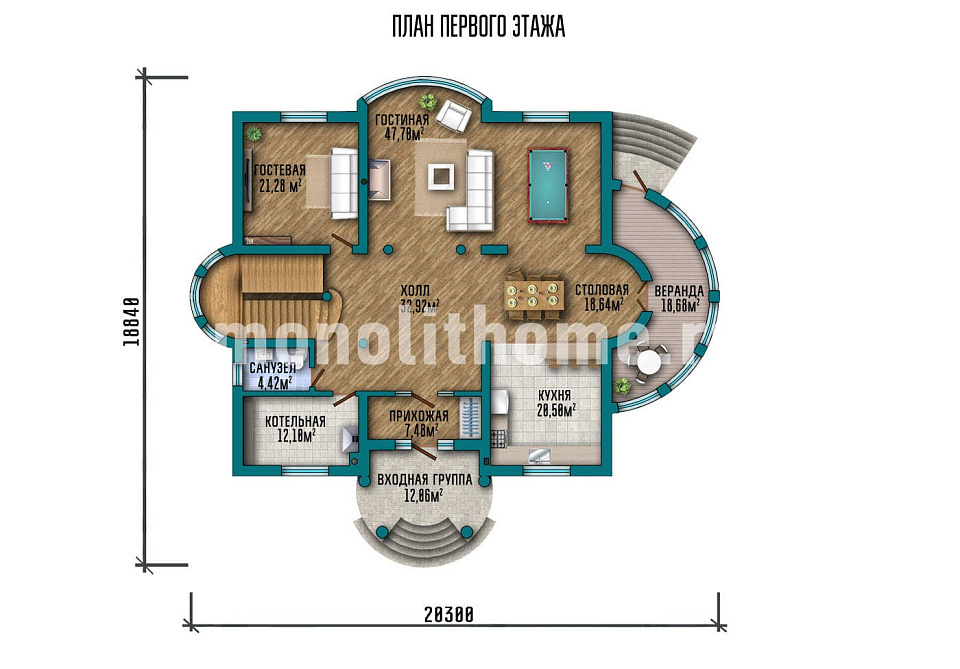 Представляем величественный дом "Кромвель-2" спроектированный в компании Монолит-домстрой по результатам встречи с заказчиком в нашем офисе. Отличительной чертой этого проекта является неповторимое ощущение комфорта, создаваемое роскошным камином. Помимо эстетического наслаждения камин является практичным обогревателем, который отлично обогреет помещение в холодное время года.