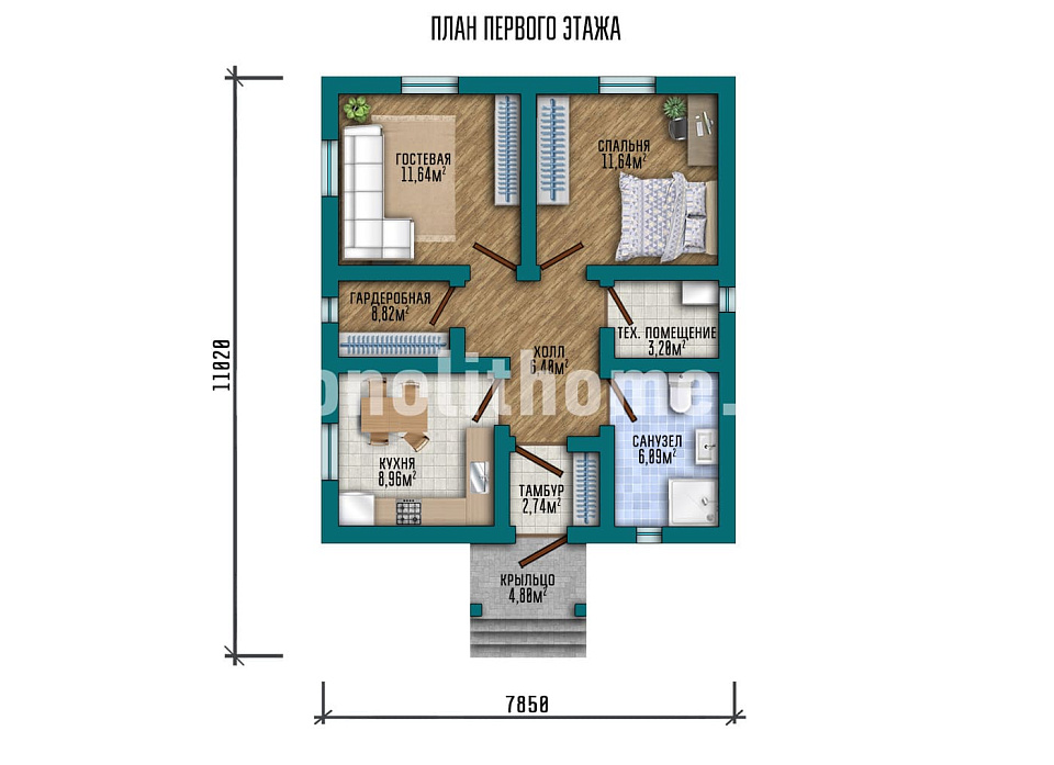 Проектом предусматривается одноэтажное здание с удобным чердаком. Планировка внутренних помещений отличается функциональностью и принимает во внимание размещение инженерных систем, вид из окон и расположение сторон света. Планировочные планы предусматривают 2 комфортных спальни и 1 санузел. Планировочная площадь здания составляет 56 м2, площадь кухни 9 м2. Для этого проекта мы рекомендуем применить тип фундамента - монолитная плита толщиной 250 мм. Это простой и наиболее дешевый вариант фундамента из всех. Стены этого проекта - клееный брус. По решению заказчика наши конструкторы изменят проект под другой материал несущих конструкций, архитекторы адаптируют планировки и примут во внимание любые другие требования клиента.