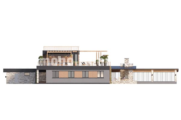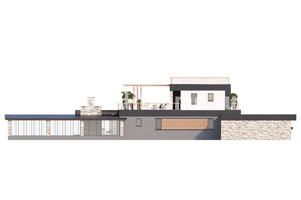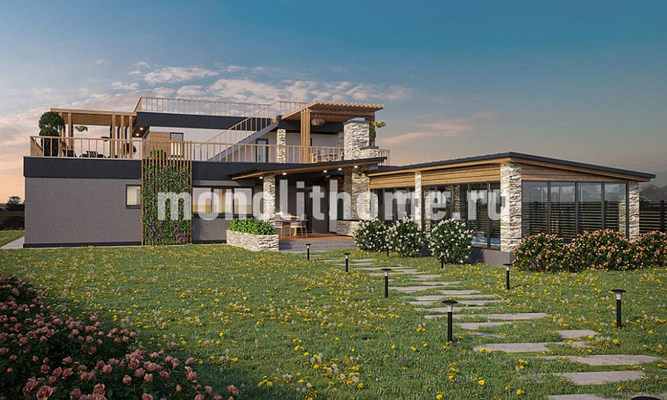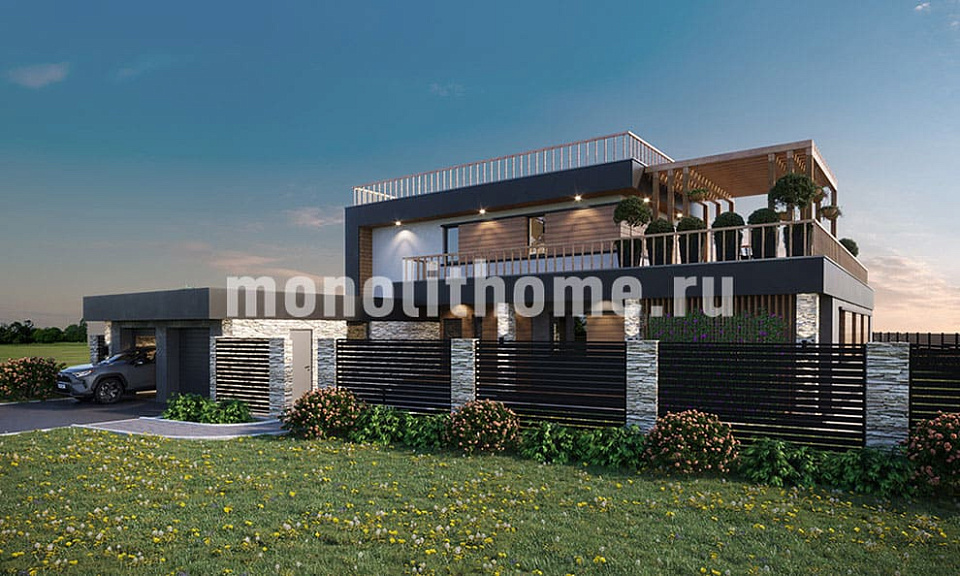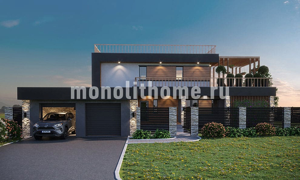 Коттедж в два полных этажа с плоской крышей. Планировка внутреннего пространства отличается функциональностью и учитывает размещение инженерных систем, вид из окон и расположение сторон света. Планировка коттеджа включает 5 комфортных спален и 3 санузла. Размер помещений дома составляет 355 м2, площадь кухонного пространства 19 м2. В этом случае мы советуем применить фундамент - бетонная лента мелкого заложения утепленная Данный фундамент отлично подходит если в пятне застройки существенный перепад высоты рельефа, или хозяин планирует поднять над землей уровень пола. Несущие стены данного коттеджа - керамические блоки. Мы можем изменить проект под другой материал несущих конструкций, переработать планировки дома и принять по внимание любые другие требования заказчика.