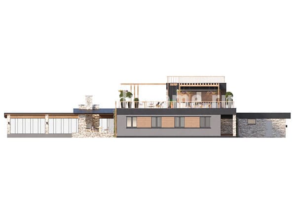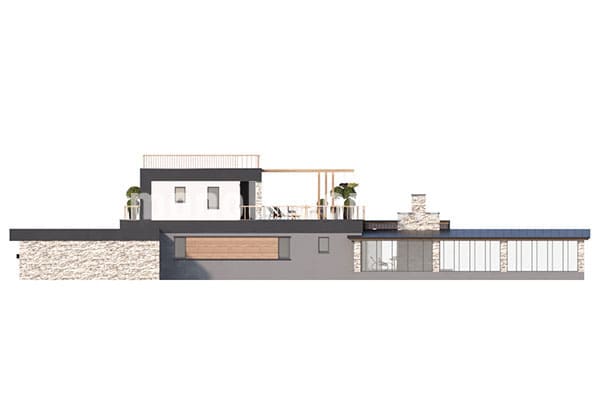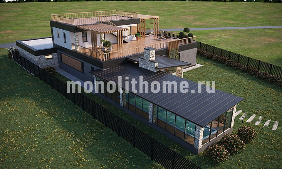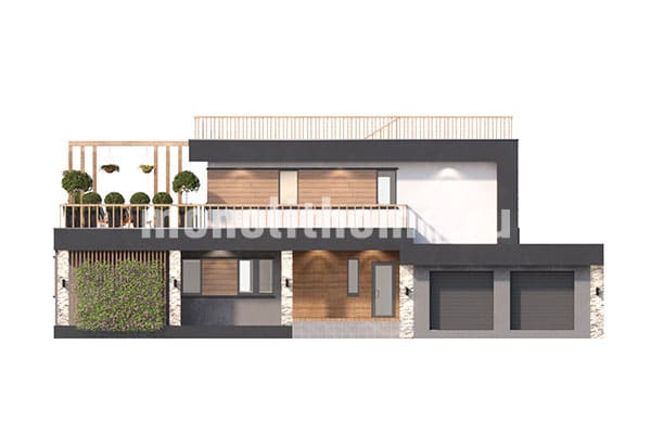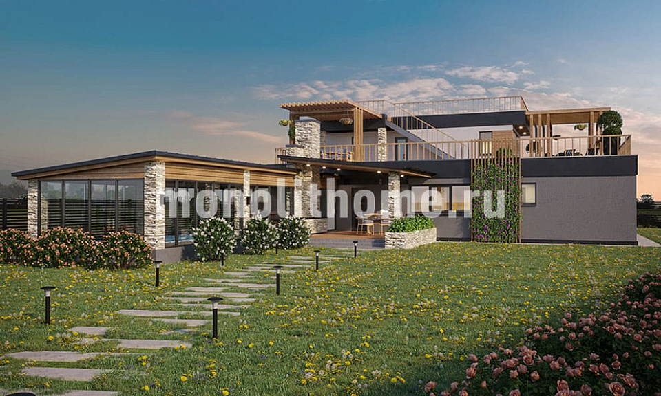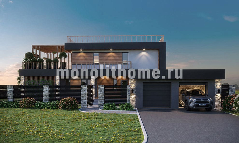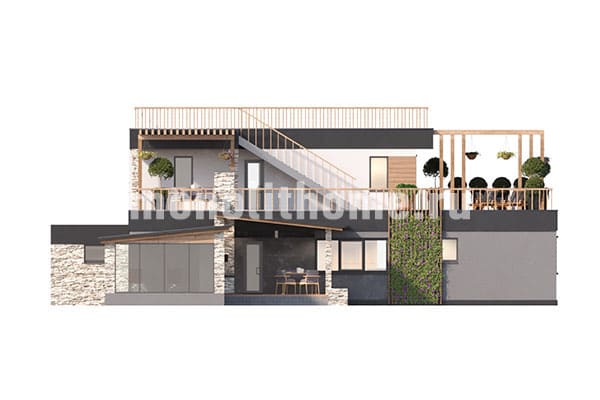 Проектом предусматривается двухэтажное здание с плоской крышей из ПВХ мембраны. Планировка помещений выделятся функциональностью и учитывает размещение инженерных систем, вид из окон и расположение сторон света. Планировочные планы здания включают 5 удобных спален и 3 санузла. Площадь помещений здания составляет 355 м2, размер кухни 19 м2. Для этого коттеджа мы рекомендуем использовать вариант фундамента - бетонная лента мелкого заложения с утеплением Этот вариант фундамента отлично подходит, когда в пятне застройки существенный перепад высоты рельефа, или клиент планирует поднять выше уровень первого этажа. Стены данного коттеджа - несъемная опалубка. По вашему решению мы можем переделать этот проект под другой материал, переработать расположение комнат дома и принять по внимание другие ваши условия.