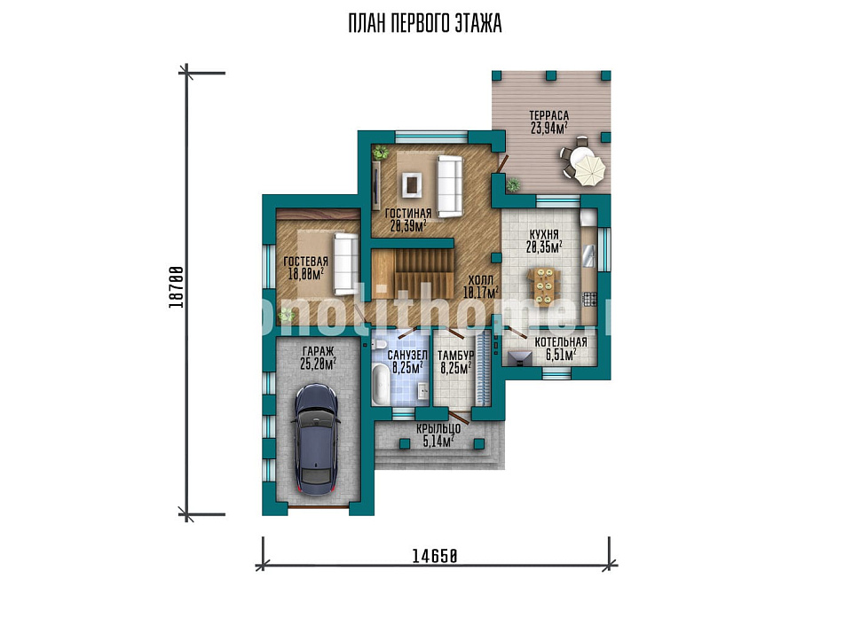 - Размер дома 14х14 м