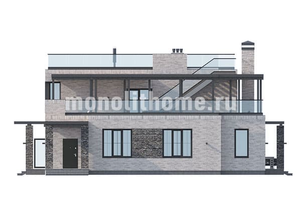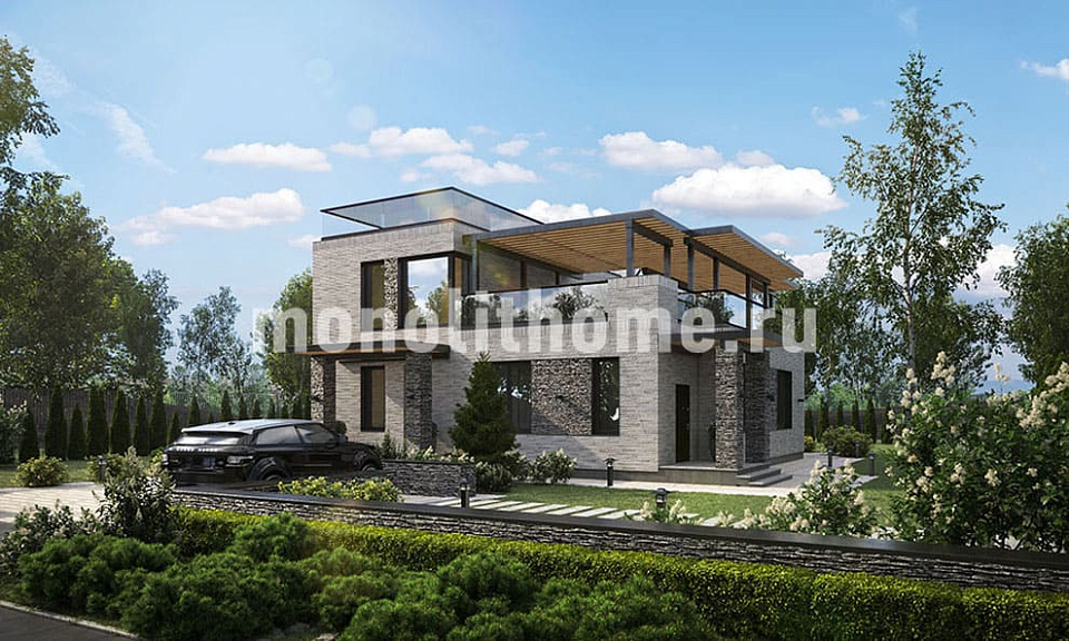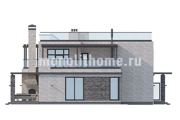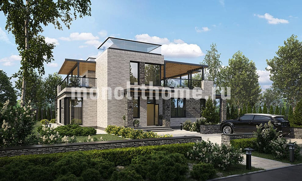 Проектом предусматривается двухэтажное строение с плоской кровлей. Планировка внутреннего пространства выделятся функциональностью и принимает во внимание размещение инженерных систем, вид из окон и расположение сторон света. Проект дома включает 4 удобных спальни и 3 санузла. Полезная площадь помещений составляет 351 м2, размер кухонного пространства 18 м2. Для этого дома мы рекомендуем использовать тип фундамента - бетонная мелко-заглубленная утепленная лента. Данный вариант фундамента идеально подходит, когда под домом существенный перепад высоты, или хозяин дома требует приподнять выше над землей уровень помещений. Материал стен этого коттеджа - газосиликат. По вашему решению наши конструкторы изменят данный проект под другой материал стен, архитекторы симметрично развернут планировки и учтут любые другие идеи клиента.