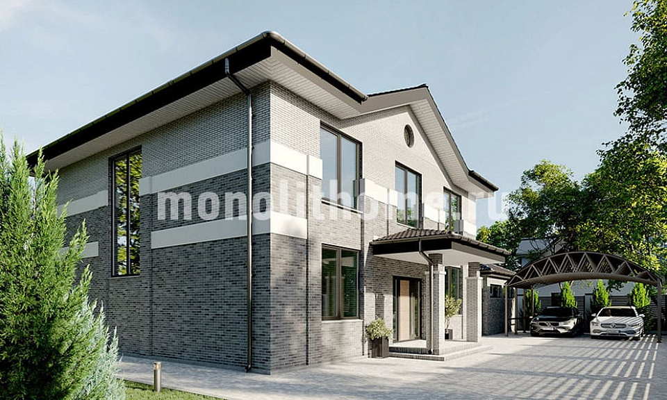 Коттедж в два этажа плюс полезный чердак. Планировка внутренних помещений выделятся функциональностью и принимает во внимание размещение инженерных систем, вид из окон и расположение сторон света. Планировочные решения предусматривают 4 уютных спальни и 3 санузла. Планировочная площадь помещений здания - 229 м2, размер кухни 13 м2. Для этого проекта мы предусматриваем фундамент - монолитная лента мелко-заглубленная с утеплением Такая конструкция фундамента оптимально подходит, когда на участке значительный перепад уровня земли, или наш заказчик планирует поднять выше над землей уровень пола первого этажа. Материал несущих стен здания - керамический кирпич. Мы можем переделать проект под другой материал несущих конструкций, детализировать планировки этажей и рассмотреть любые другие ваши требования.