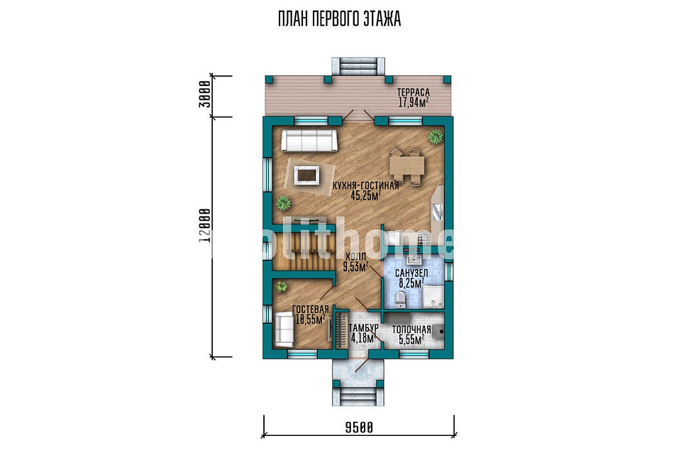 Представляем вашему вниманию проект частного дома наиболее популярного ценового сегмента "Устюг" реализованный специалистами компании Монолит-домстрой по рекомендациям заказчика. Уникальная черта дома это - большая, красивая терраса. которая соединяет внутренние помещения дома и окружающую природу. На этой комфортной веранде вы сможете шикарно пообедать на свежем воздухе с друзьями и близкими.
