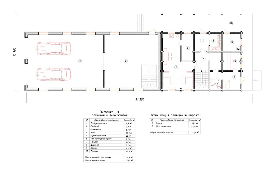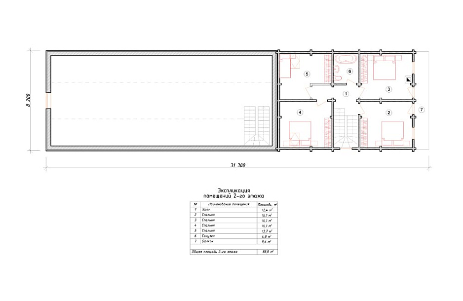 Проектом предусматривается одноэтажное здание и жилой мансардный этаж. Компоновка внутреннего пространства отличается продуманностью и учитывает размещение инженерных систем, вид из окон и расположение сторон света. Планировочные планы включают 4 комфортных спальни и 2 санузла. Размер всех помещений здания - 223 м2, площадь кухонного пространства 14 м2. Для этого коттеджа мы предлагаем использовать тип фундамента - бетонная мелко-заглубленная лента с утеплением. Этот вариант фундамента идеально подходит, когда в пятне застройки большой перепад уровня земли, или заказчик планирует поднять выше уровень комнат первого этажа. Стены по проекту - оцилиндрованное бревно. В случае необходимости мы можем изменить этот проект под другой материал стен, переработать планировки этажей и принять по внимание другие пожелания заказчика.