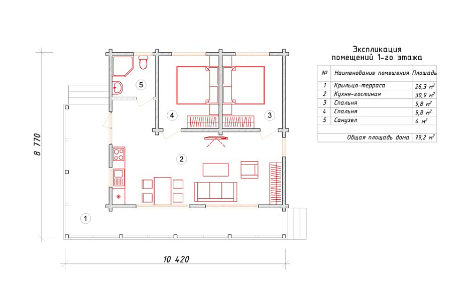 Проектом предусматривается одноэтажный коттедж плюс объемное чердачное помещение. Планировка жилых помещений отличается разумностью и учитывает размещение инженерных систем, вид из окон и расположение сторон света. Планировочные решения здания предусматривают 2 комфортных спальни и 1 санузел. Планировочная площадь всех помещений дома - 79 м2, размер кухонного пространства 15 м2. В этом доме мы предусматриваем тип фундамента - мелко-заглубленная плита толщиной 250 мм. Это простой и самый экономически выгодный тип фундамент из всех. Материал несущих конструкций коттеджа - профилированный брус. По решению заказчика наши конструкторы изменят проект под другой материал несущих конструкций, архитекторы адаптируют планировки и примут во внимание любые другие требования клиента.