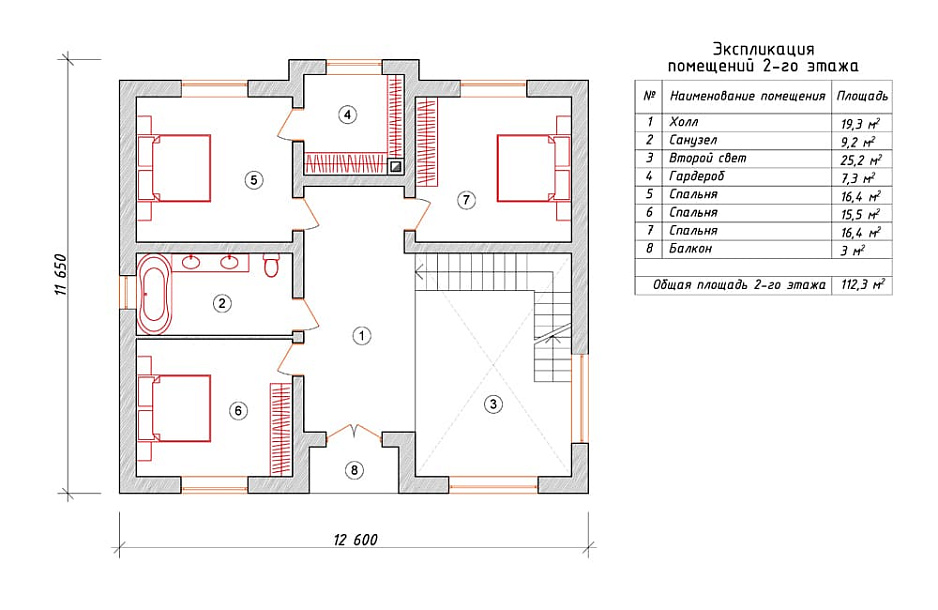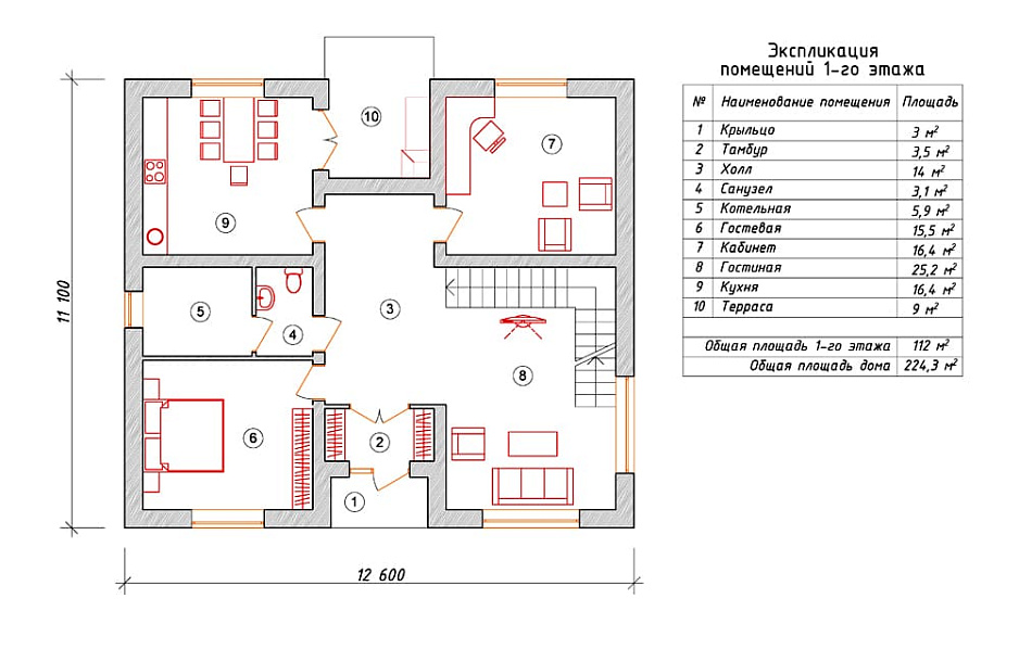 Проектом предусматривается двухэтажный коттедж и нежилой чердак. Компоновка пространства дома характеризуется функциональностью и принимает во внимание размещение инженерных систем, вид из окон и расположение сторон света. Планировка дома включает 4 удобных спальни и 2 санузла. Площадь всех помещений дома - 224 м2, размер кухонного пространства 16 м2. В данном доме мы предусматриваем фундамент - утепленная шведская плита. Это наиболее теплый фундамент, идеально подходящий для коттеджного строительства в нашей климатической зоне. Материал несущих конструкций данного проекта - клееный брус. Мы можем поменять данный проект под другой материал, переработать жилое пространство дома и рассмотреть другие ваши требования.