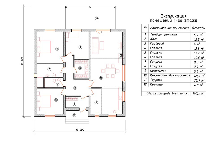 Проектом предусматривается одноэтажный дом и удобный чердак. Планировка комнат характеризуется функциональностью и принимает во внимание размещение инженерных систем, вид из окон и расположение сторон света. Планировка дома предусматривает 3 удобных спальни и 2 санузла. Полезная площадь дома - 168 м2, площадь кухонного пространства 18 м2. Для этого дома мы советуем использовать тип фундамента - монолитная армированная плита мелкого заложения толщиной 300 мм. Это практичный и самый экономически целесообразный фундамент из всех. Материал стен данного проекта - клееный брус. По вашему решению мы можем переделать этот проект под другой материал, переработать расположение комнат дома и принять по внимание другие ваши условия.