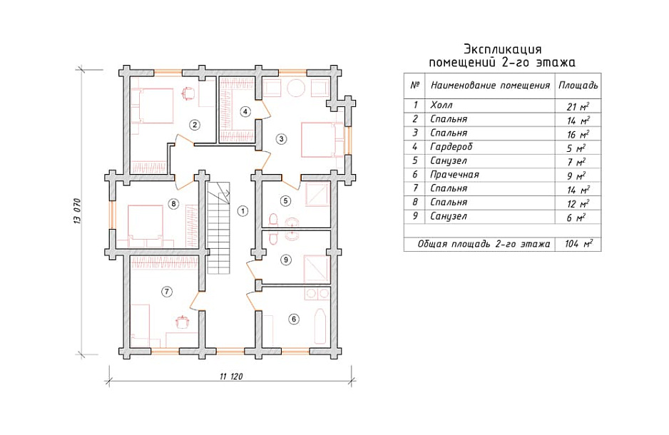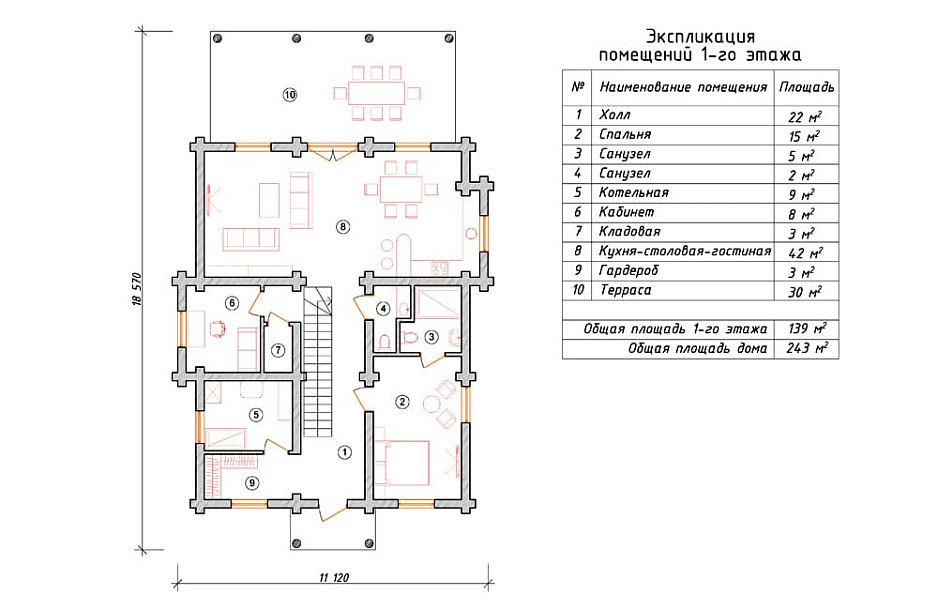 Коттедж в два полных этажа и холодный чердак. Компоновка помещений характеризуется продуманностью и учитывает размещение инженерных систем, вид из окон и расположение сторон света. Планировочные планы коттеджа включают 5 комфортных спален и 3 санузла. Планировочная площадь всех помещений дома составляет 243 м2, размер кухни 18 м2. Для этого коттеджа мы советуем применить вариант фундамента - УШП плита. Это самый теплый фундамент, великолепно подходящий для загородного строительства в нашем холодном климате. По проекту материал стен здания - оцилиндрованное бревно. Наши конструкторы могут поменять данный проект под другой материал, архитекторы адаптируют расположение комнат и рассмотрят другие идеи клиента.