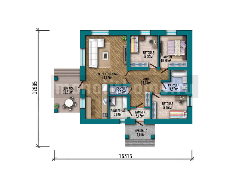 Дом из керамзитобетона Каспио 2 одноэтажный 12х12