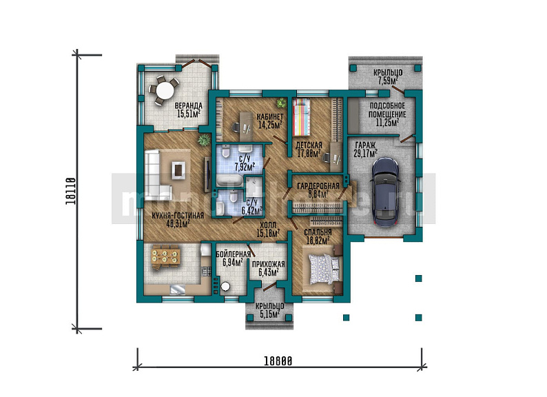 Дом из пеноблоков Квадро одноэтажный 15х15
