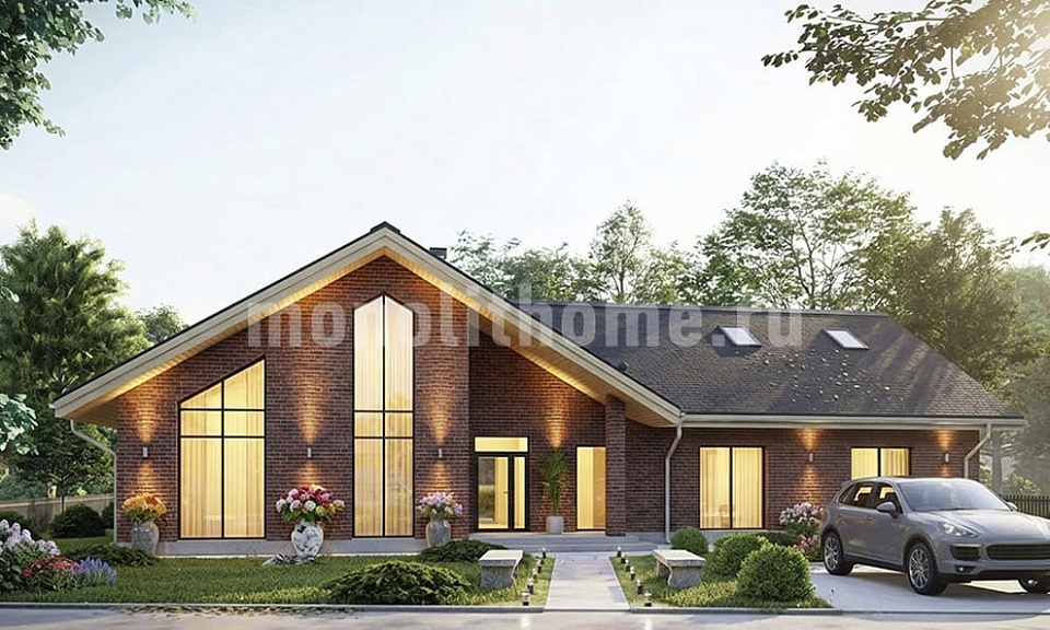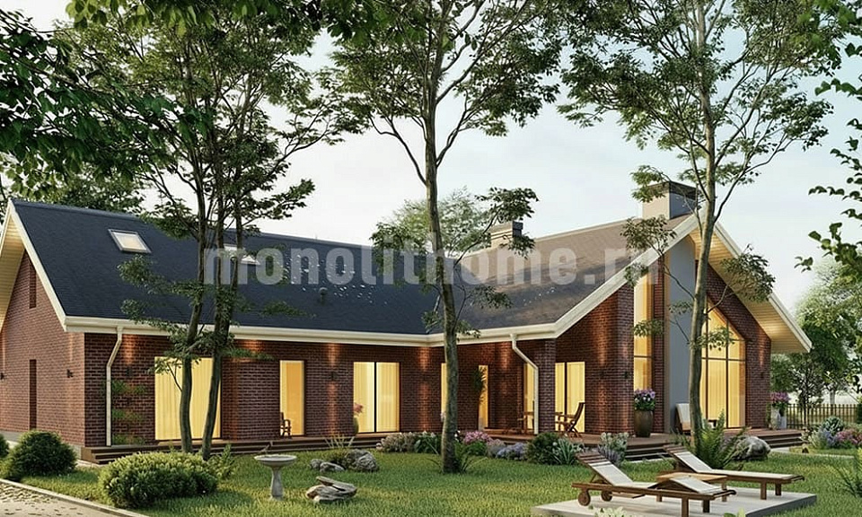 Дом из поризованного кирпича Дарьино 10 одноэтажный с мансардой 14х14