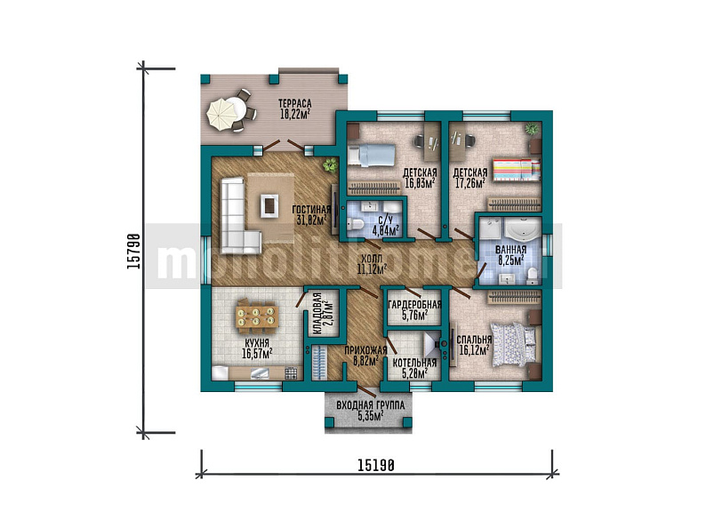 Дом из теплоблоков Феникс одноэтажный 15х15