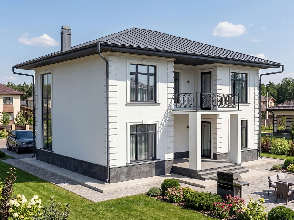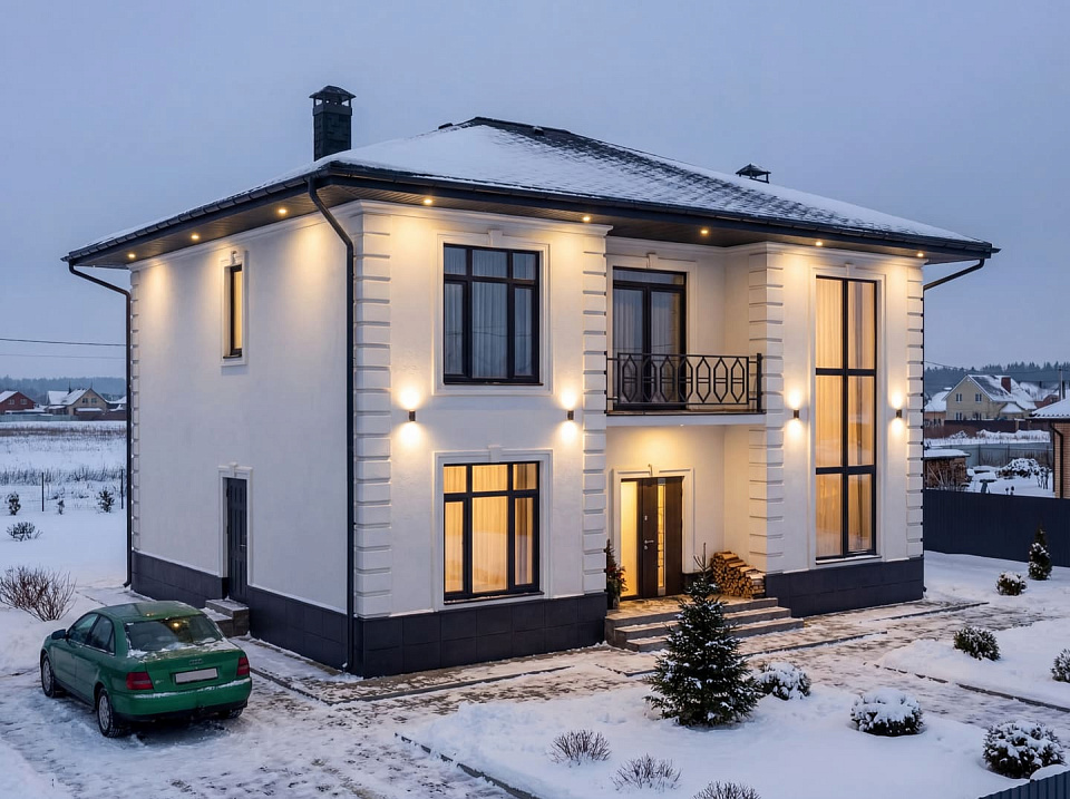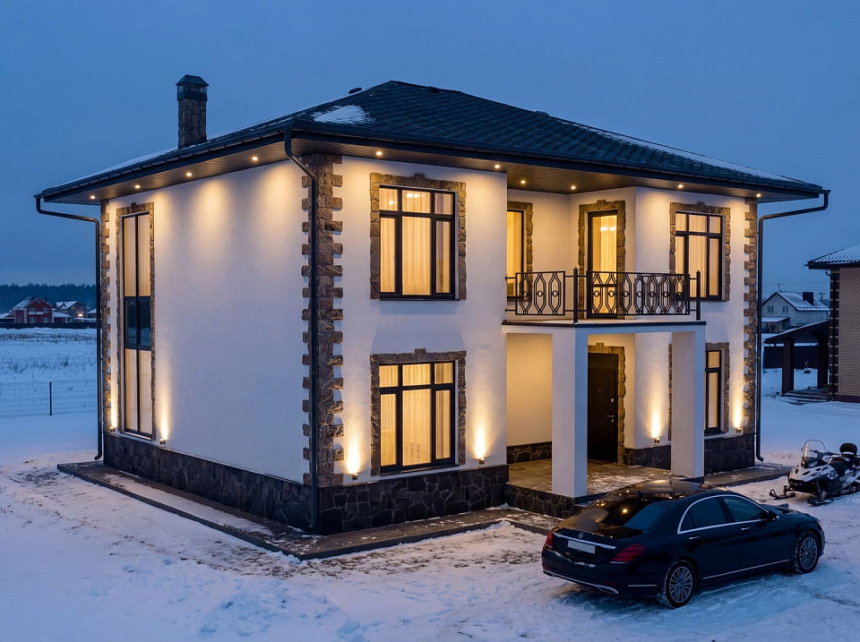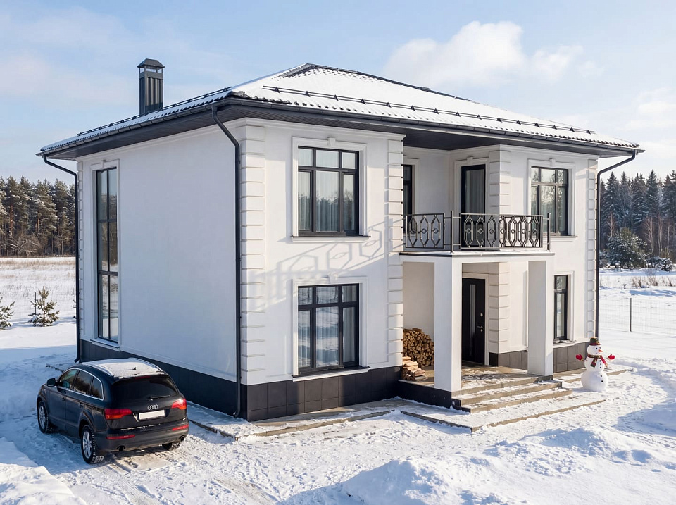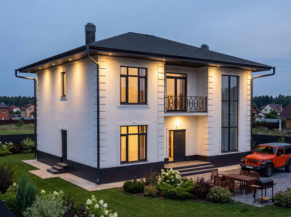 Представляем проект загородного дома недорогого сегмента "Гассен" созданный архитекторами компании Монолит-домстрой по индивидуальному заказу. Основное достоинство данного коттеджа это - праздничное настроение в интерьерах дома, которое возникает по причине огромных окон. Нужно сказать, что вопреки широко распространенному мнению панорамные окна не приводят к увеличению стоимости строительства дома. Современные конструкции делают возможным увеличение высоты и ширины остекления, не повышая теплопотери дома.