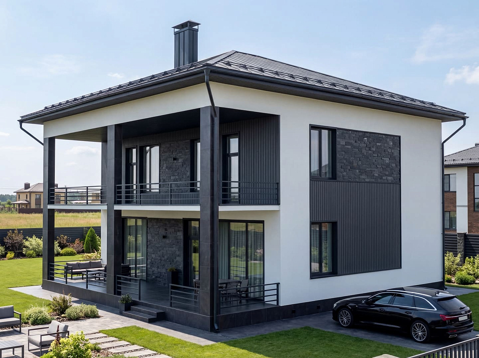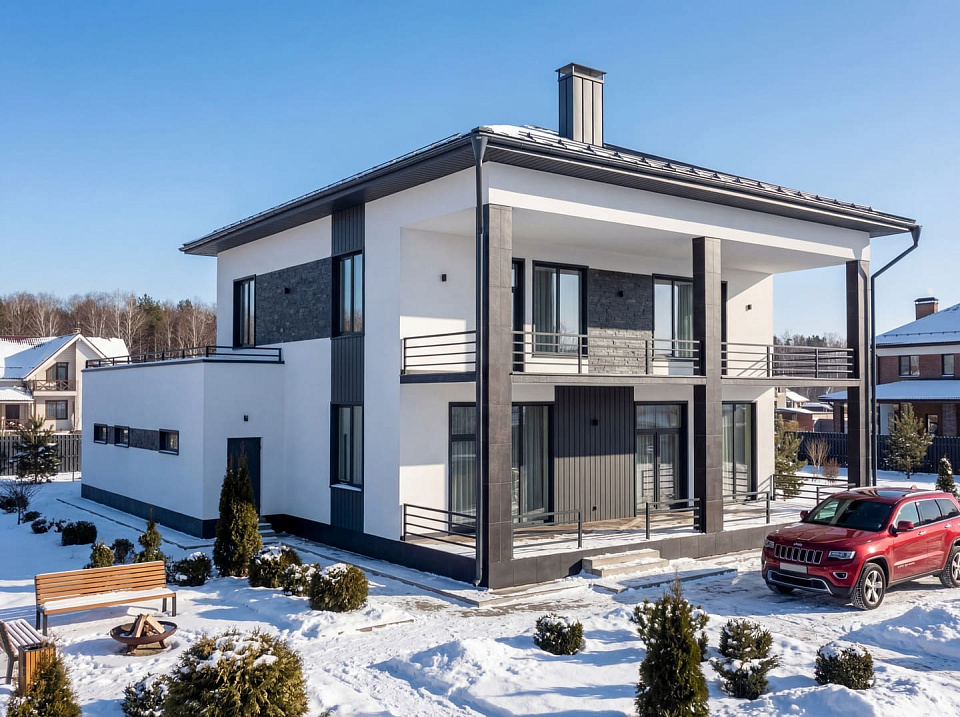 Представляем роскошный коттедж "Мякинино" разработанный нашими архитекторами по рекомендациям заказчика. Очевидным плюсом этого проекта является ощущение торжественности внутреннего пространства дома, которое возникает благодаря большой площади остекления. Современные конструктивные решения делают возможным увеличение площади окон, не уменьшая энергоэффективность дома. Нужно подчеркнуть, что вопреки существующему мнению панорамные окна не являются причиной повышения стоимости строительства дома.