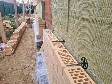 - Отделка фасад кирпичом - очень трудоемкий процесс, требующий высокого профессионализма от рабочих. До начала работ цоколь идеально выравнивается правилом. Первый ряд кладки выкладывается с применением уровня. До начала кладки мы полностью раскладываем кирпичи по периметру сооружения. Это позволяет заранее определить места, в которых будет размещаться половинчатые кирпичи, подогнать швы для выполнения связки в углах стен и у оконных и дверных проемов, наметить тепловые отсечки.